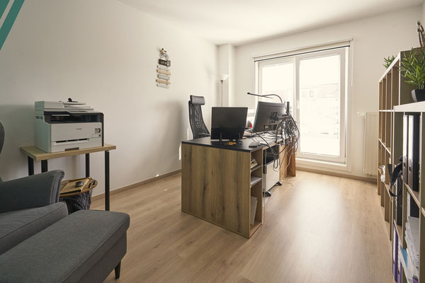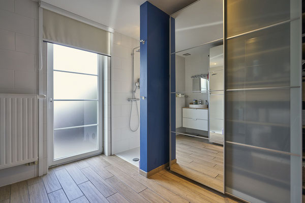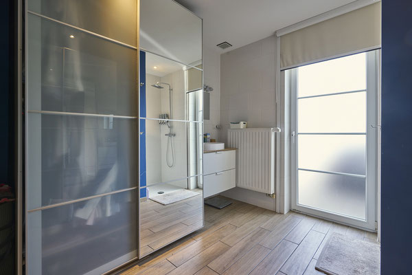 - Un chambre à coucher de +/- 18m² avec espace douche pouvant être convertie en bureau.